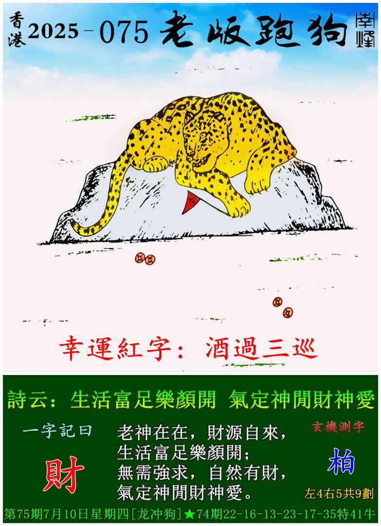 075期老版跑狗一字記之曰:【財】 詩雲:生活富足樂顏開,氣定神閒財神愛。