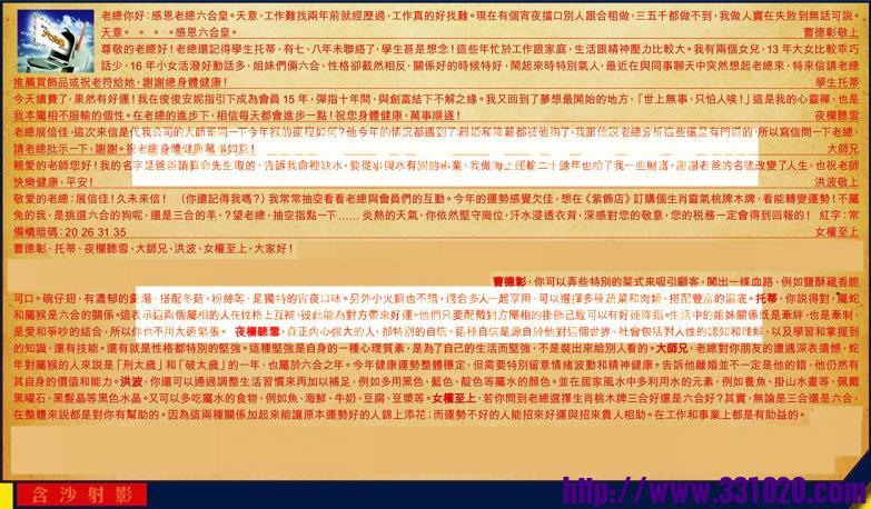 【6】.敬愛的老總:展信佳!久未來信!(你還記得我嗎?)我常常抽空看看老總與會員們的互動。今年的運勢感覺欠佳,想在《紫飾店》訂購個生肖靈氣桃牌木牌,看能轉變運勢!不屬兔的我,是挑選六合的狗呢,還是三合的羊、?望老總,抽空指點一下......炎熱的天氣,你依然堅守崗位,汗水浸透衣背,深感對您的敬意,您的税務一定會得到回報的!紅字:常備墳暗碼:20 26 31 35 女權至上