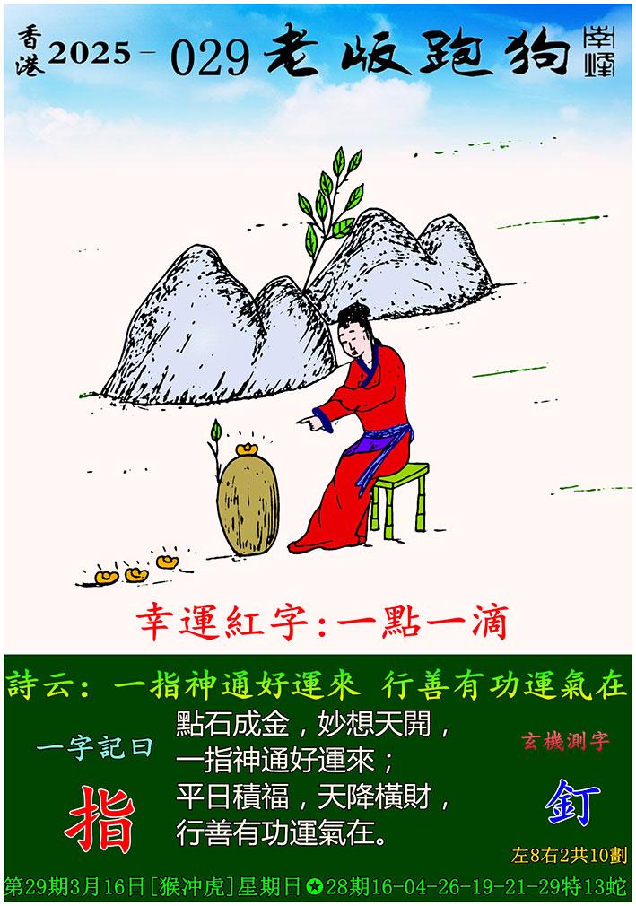 029期老版跑狗一字記之曰:【指】 詩雲:一指神通好運來,行善有功運氣在。