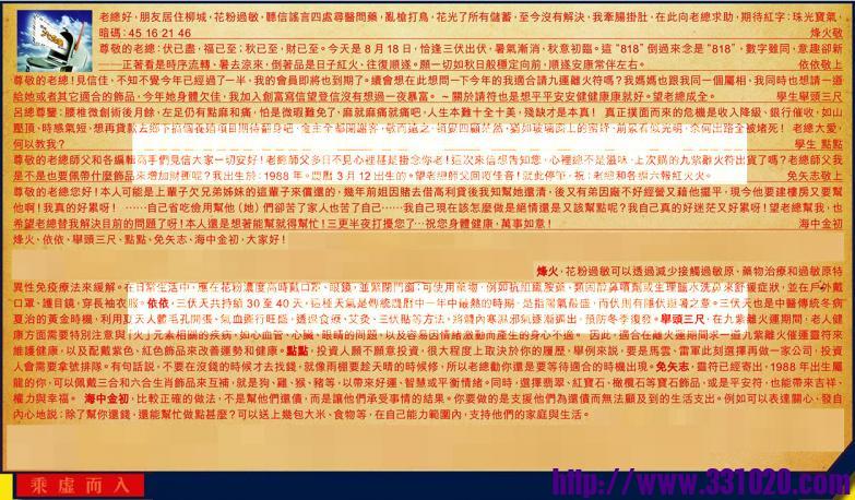 【1】.老總好,朋友居住柳城,花粉過敏,聽信謠言四處尋醫問藥,亂槍打鳥,花光了所有儲蓄,至今沒有解決,我牽腸掛肚,在此向老總求助,期待紅字:珠光寶氣,暗碼:45 16 21 46 烽火敬